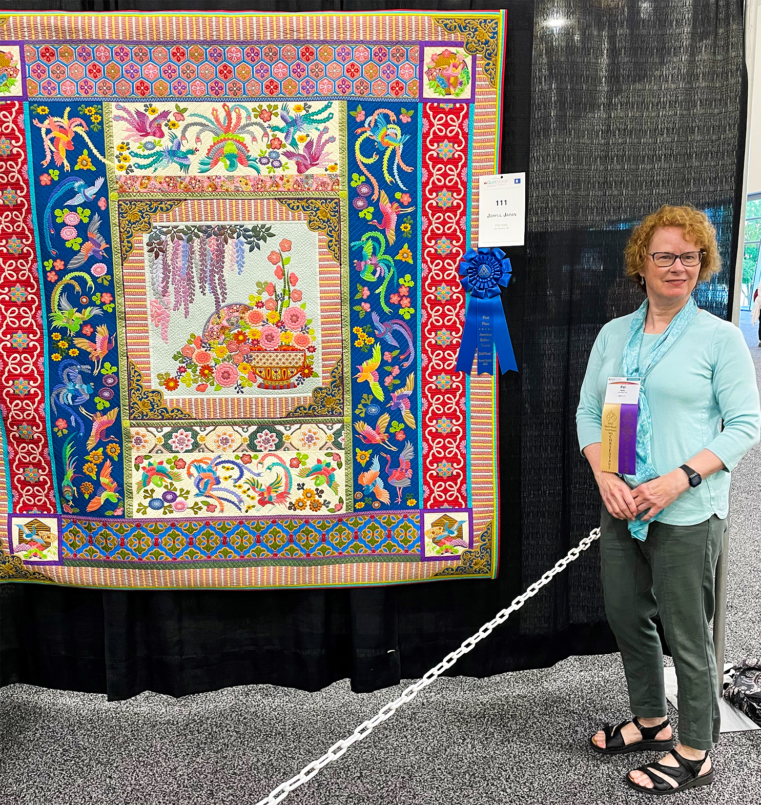 My most recent quilt, “Joyful Japan” is out on tour! Here I am at last summer’s AQS show in Grand Rapids, Michigan with a beautiful blue ribbon. This month it was at the AQS Daytona Beach show and was awarded a second place ribbon. Yea! I thought I’d share some information about how I made this quilt.